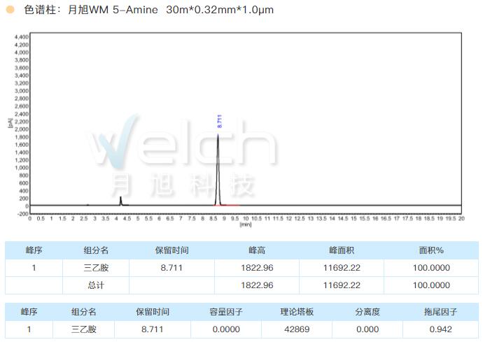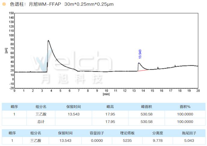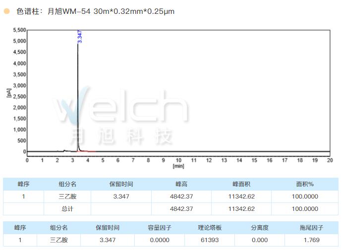 月旭科技胺改性柱WM 5-Amine 30m*0.32mm*1.0μm 檢測(cè)三乙胺有很好的峰形和柱效。由于這一類物質(zhì)在系統(tǒng)中也可能有殘留,故儀器各部件也進(jìn)行對(duì)應(yīng)的清洗更換。
